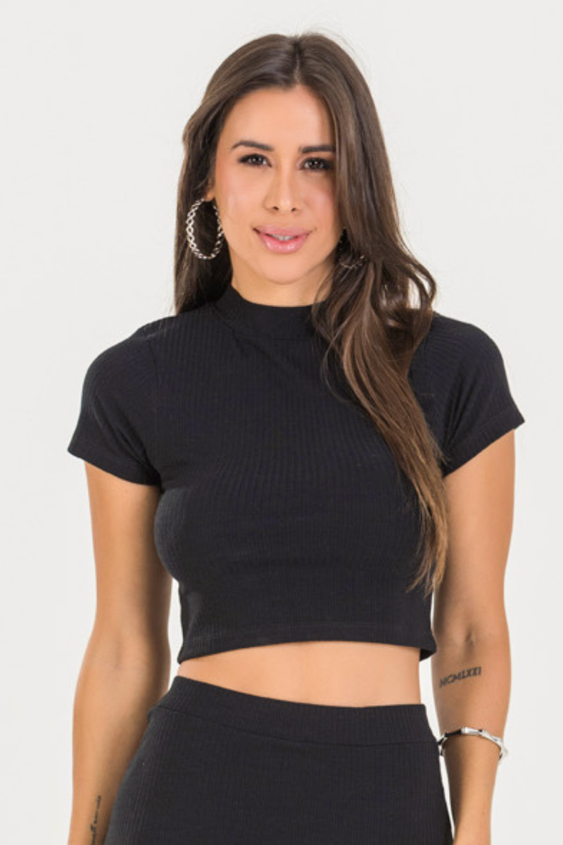 Blusa Cropped Gola Alta Canelada Poliviscose/Elastano