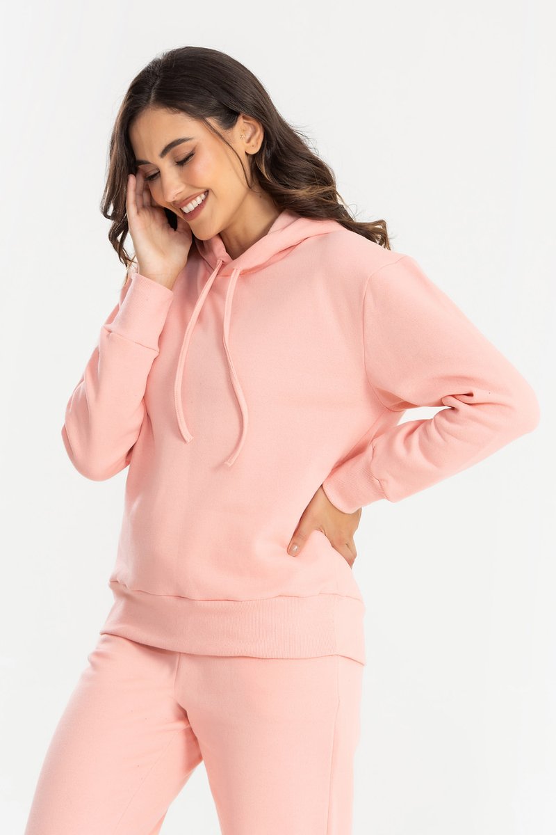 Moletom em algodão, com o avesso peluciado, punhos elásticos e capuz ajustável.