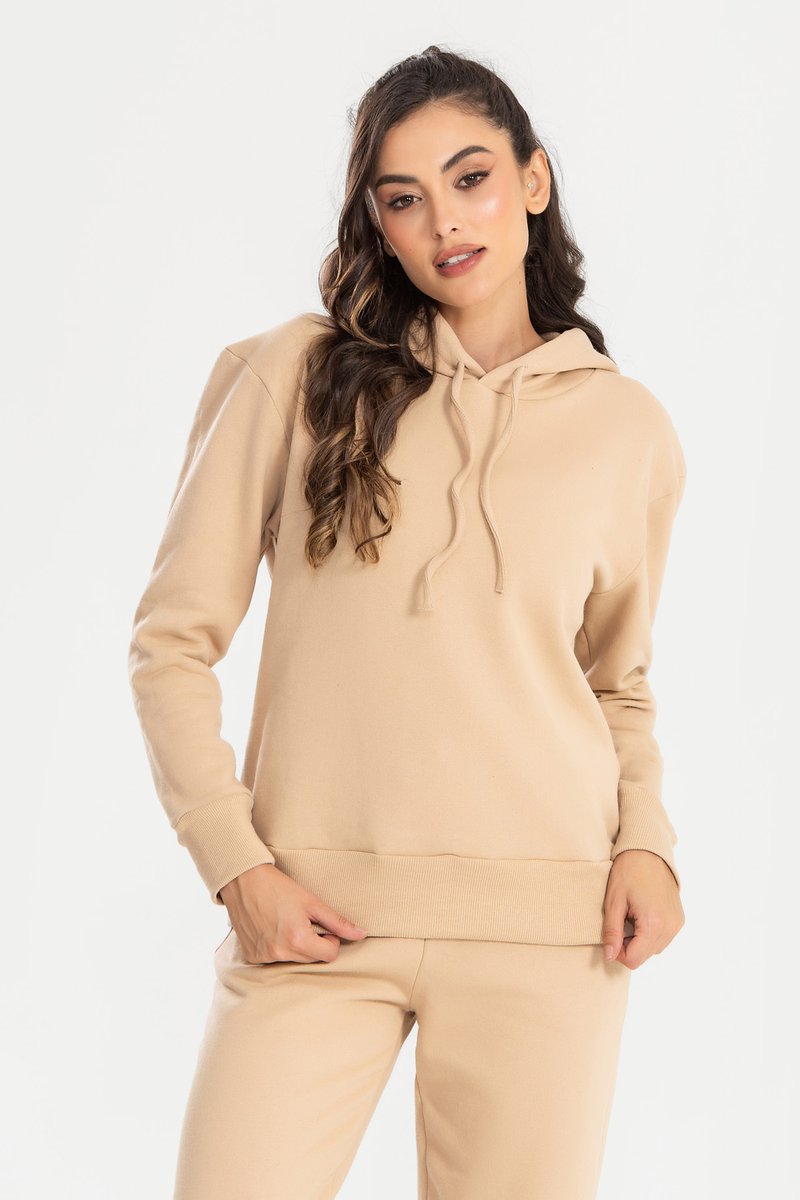 Moletom em algodão, com o avesso peluciado, punhos elásticos e capuz ajustável.