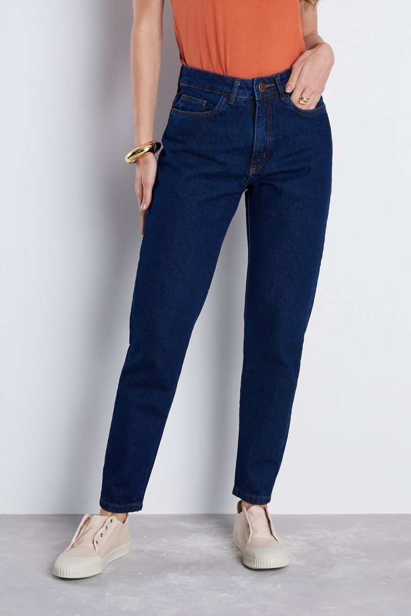 Essa mom jeans possui uma lavagem tradicional em denim com tonalidade mais escuro. Bolsos frente e costas funcionais e gancho cintura alta. Caimento soltinho se ajustando levemente na barra, da modelagem.