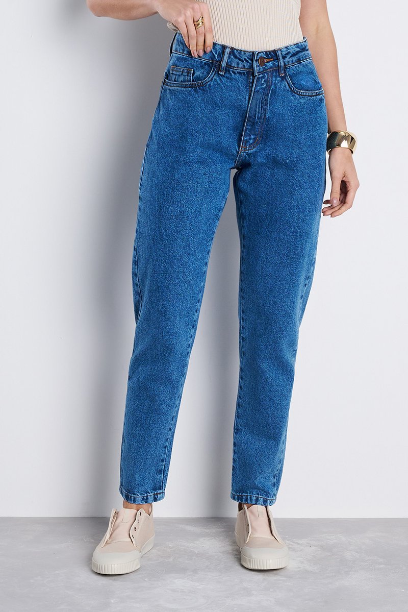 Essa mom jeans possui uma lavagem marmorizada em jeans escuro. Bolsos frente e costas funcionais e gancho cintura alta. Caimento soltinho se ajustando levemente na barra, da modelagem mom tradicional.