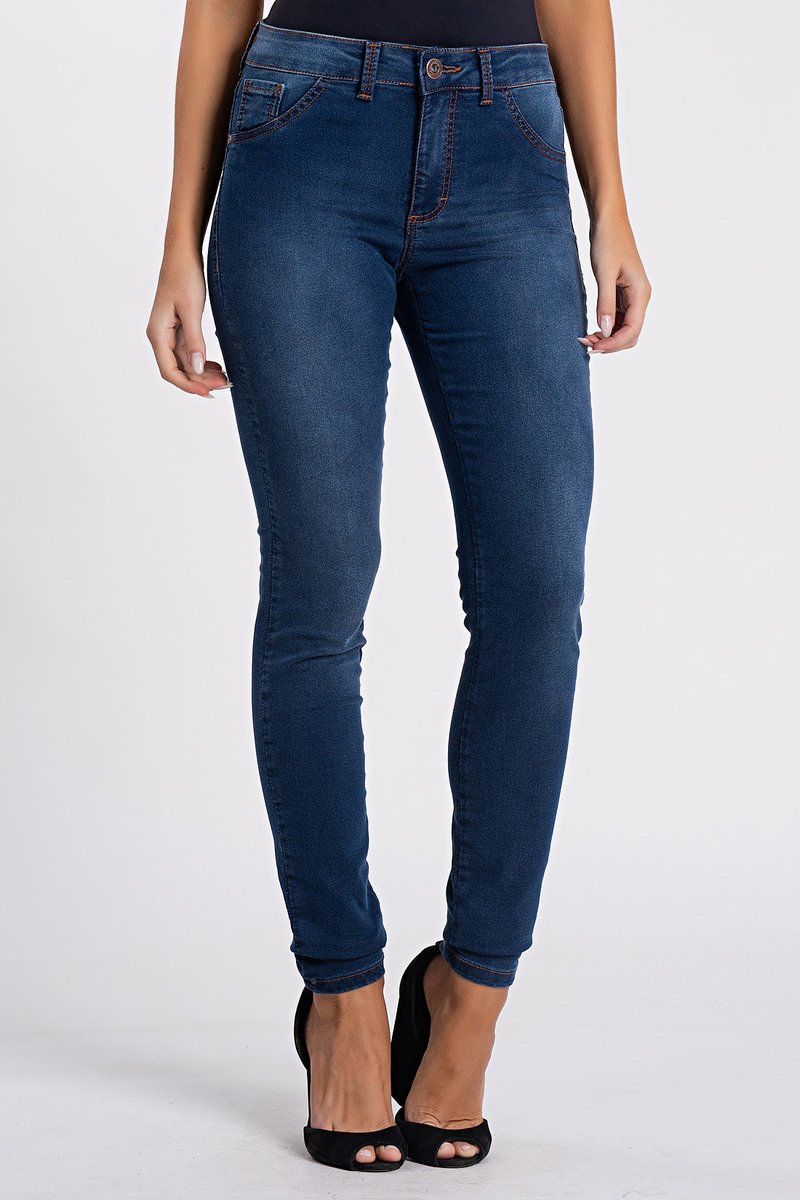 Modegalem skinny com caimento justinho ao corpo, barra regular e lavagem tradicional com leve efeito used. Costuras com linhas contrastante com o jeans.
