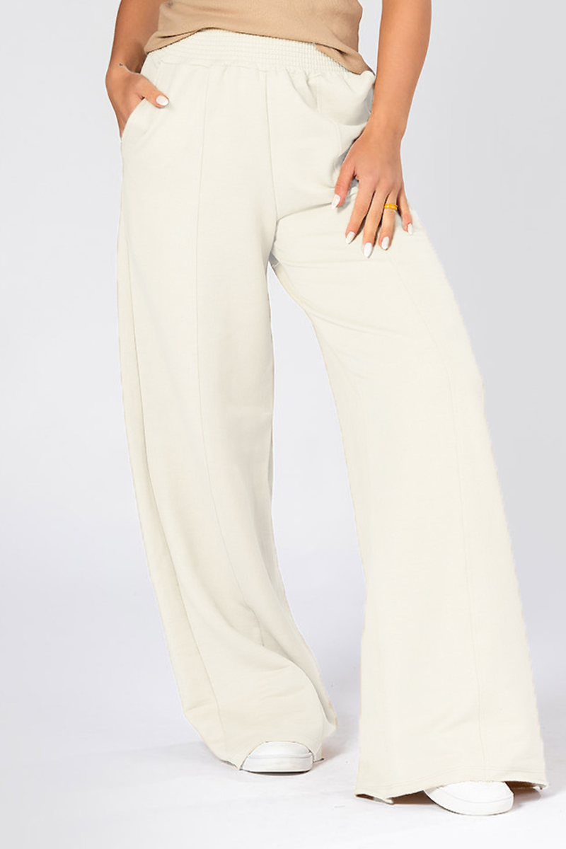 Modelagem Wide Leg, com caimento mais solto ao corpo. Bolsos internos e barra com frisos frontais. O cós possui elástico para mais conforto.
