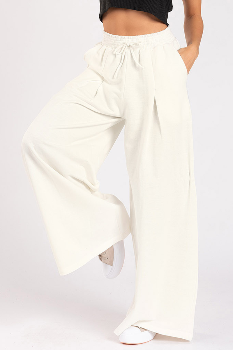 Calça Pantalona com frisos costurados na frente, confeccionada em moletinho comfy, leve e confortável. Possui cós com elástico e cordão ilustrativo. Modelagem soltinha e malha resistente.