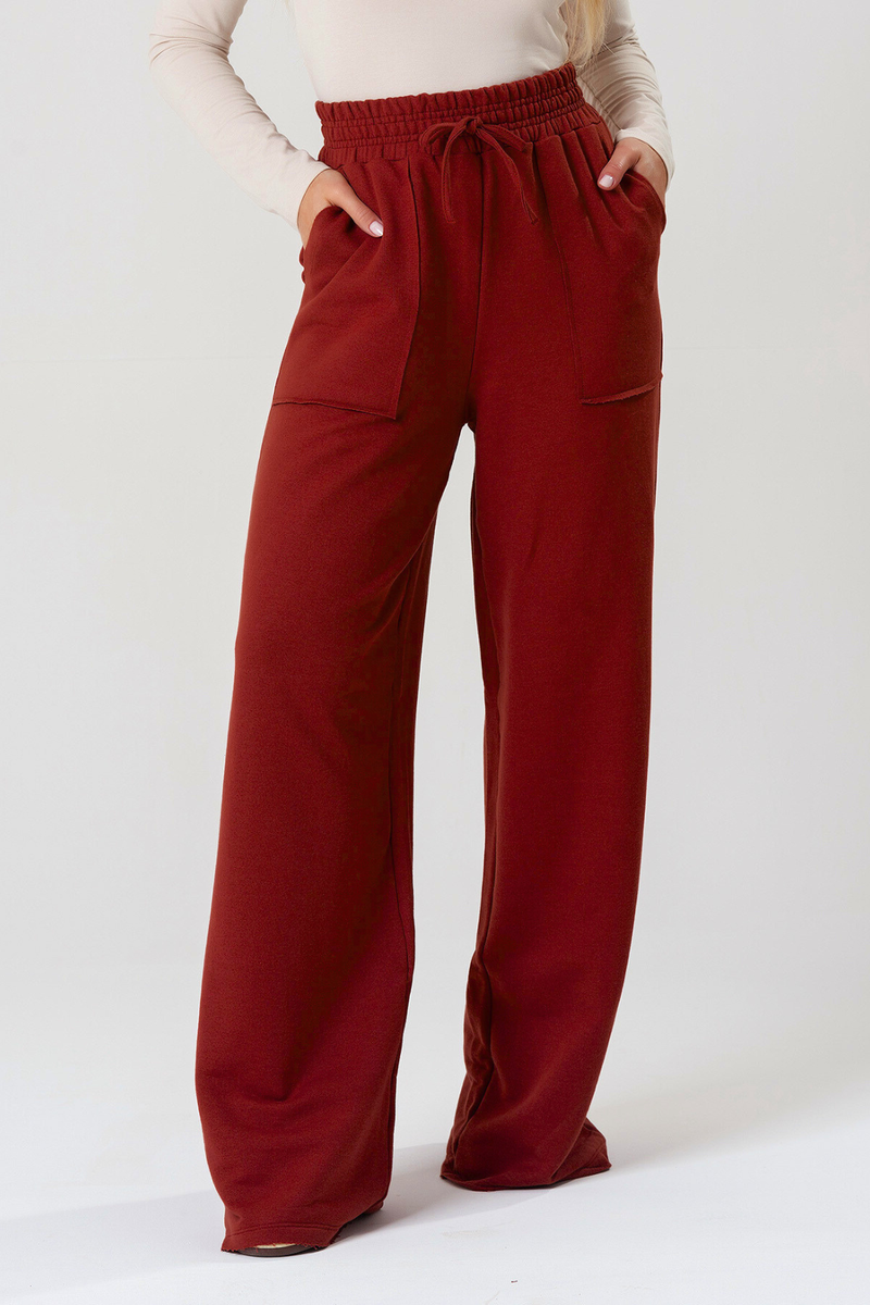 Calça Wide Leg com bolsos sobrepostos, confeccionada em moletinho comfy, leve e confortável. Possui cós com elástico e cordão ilustrativo. Modelagem soltinha. Barra com corte a fio sem bainha, e a malha é resistente.