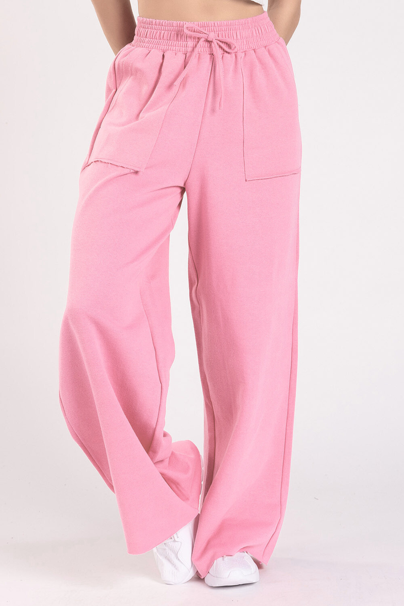 Calça Wide Leg com bolsos sobrepostos, confeccionada em moletinho comfy, leve e confortável. Possui cós com elástico e cordão ilustrativo. Modelagem soltinha. Barra com corte a fio sem bainha, e a malha é resistente.