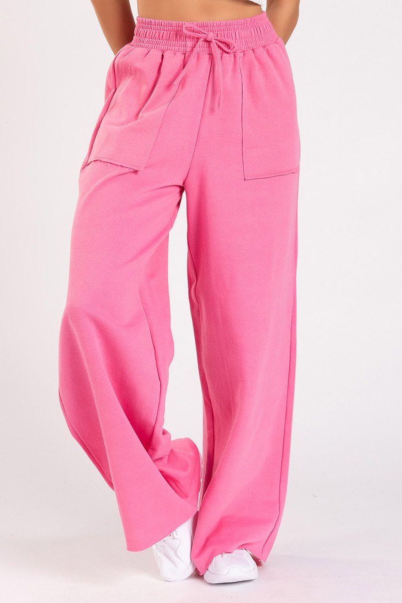 Calça Wide Leg com bolsos sobrepostos, confeccionada em moletinho comfy, leve e confortável. Possui cós com elástico e cordão ilustrativo. Modelagem soltinha. Barra com corte a fio sem bainha, e a malha é resistente.