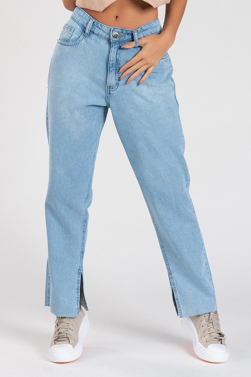 Calça mom é uma trend super estilosa e confortável que veio para ficar. Modelo confeccionado em jeans 100% algodão com lavação clarinha e modelagem soltinha, cintura alta, barra com fenda e corte a fio. Os bolsos são funcionais frente e costas.