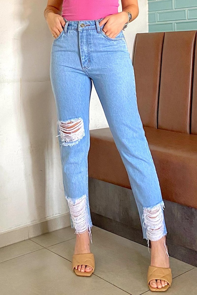 O caimento desta MOM é mais slim do quadril até a barra. Modelagem cropped, mais curtinha, com a barra desfiada e com corte a fio. Alta sensação, com lavagem em denim claro e efeitos rasgados destroyed na altura da coxa a nas barras, essa modelagem está com tudo para ganhar o selo de preferência ao usar