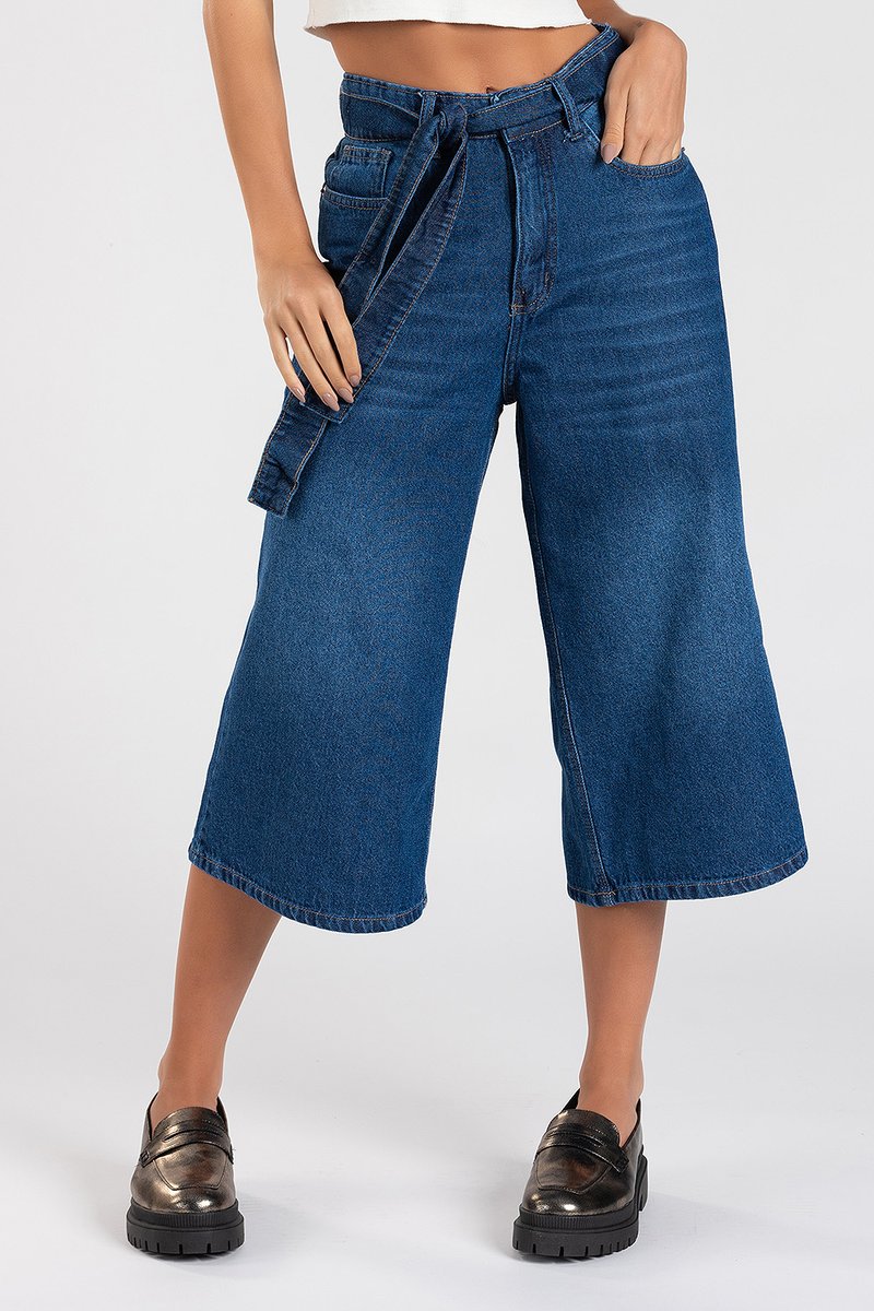 Aposte em um visual mais casual e despojado com a pantacourt jeans keith. A modelagem pantacourt é ampla, com caimento solto e comprimento mais curtinho.