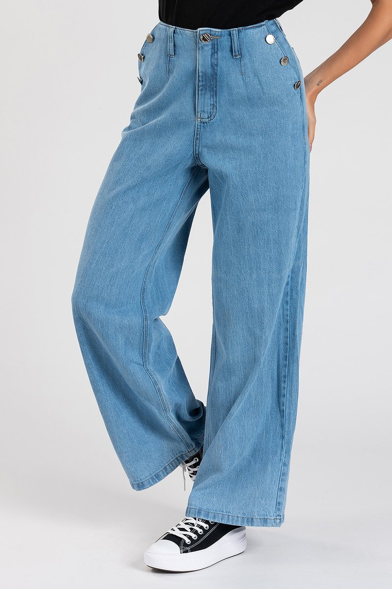 Confeccionada em jeans 100% algodão, possui lavação clara, com as tramas marcadas.