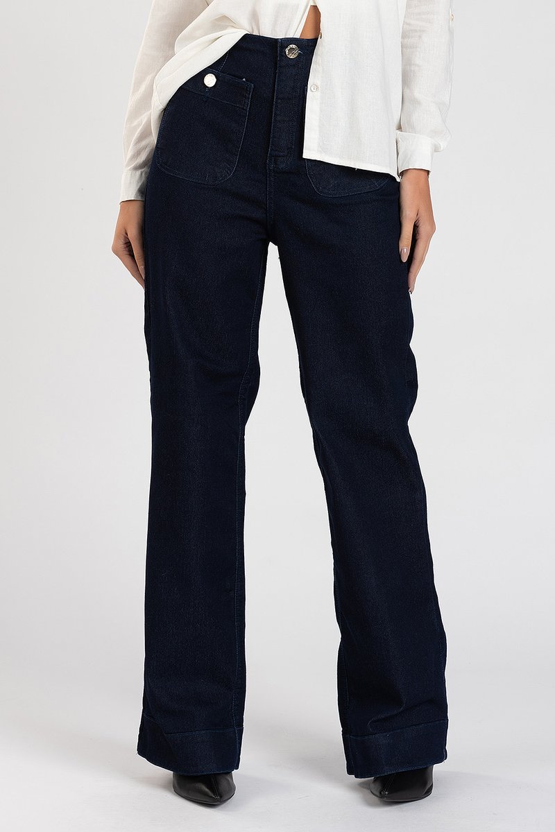 Confeccionada em jeans 97% algodão e 3% elastano, a wide Merle possui lavação escura, além disso, possui barra com caimento mais ajustado. A bainha da barra é mais alongada. Os bolsos frontais tem fechamento por botão em evidência e são funcionais, assim como os bolsos posteriores.
