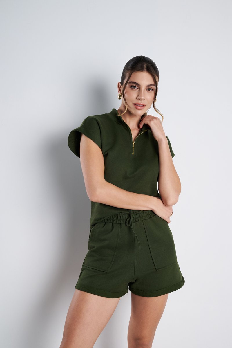 O verde militar transforma o conjunto em uma escolha contemporânea e sofisticada, perfeita para passeios, lazer ou momentos de pausa.