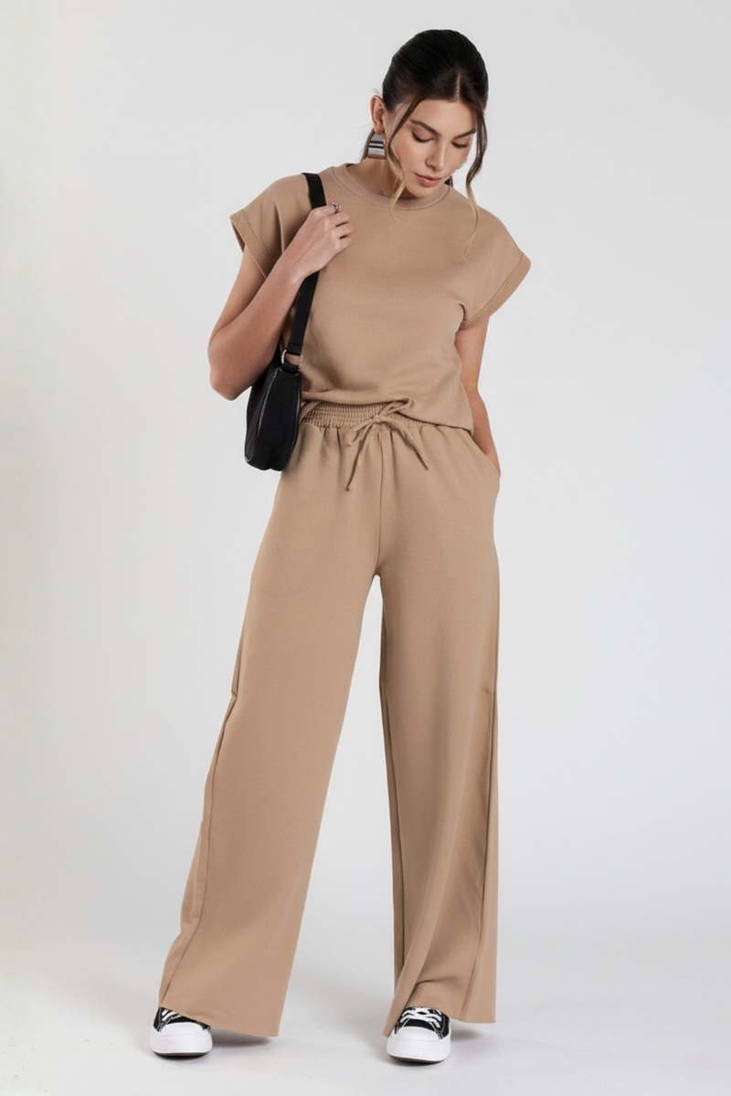 Com seu caráter terroso, o conjunto transmite sofisticação discreta e conforto, perfeito para dias de primavera e verão.