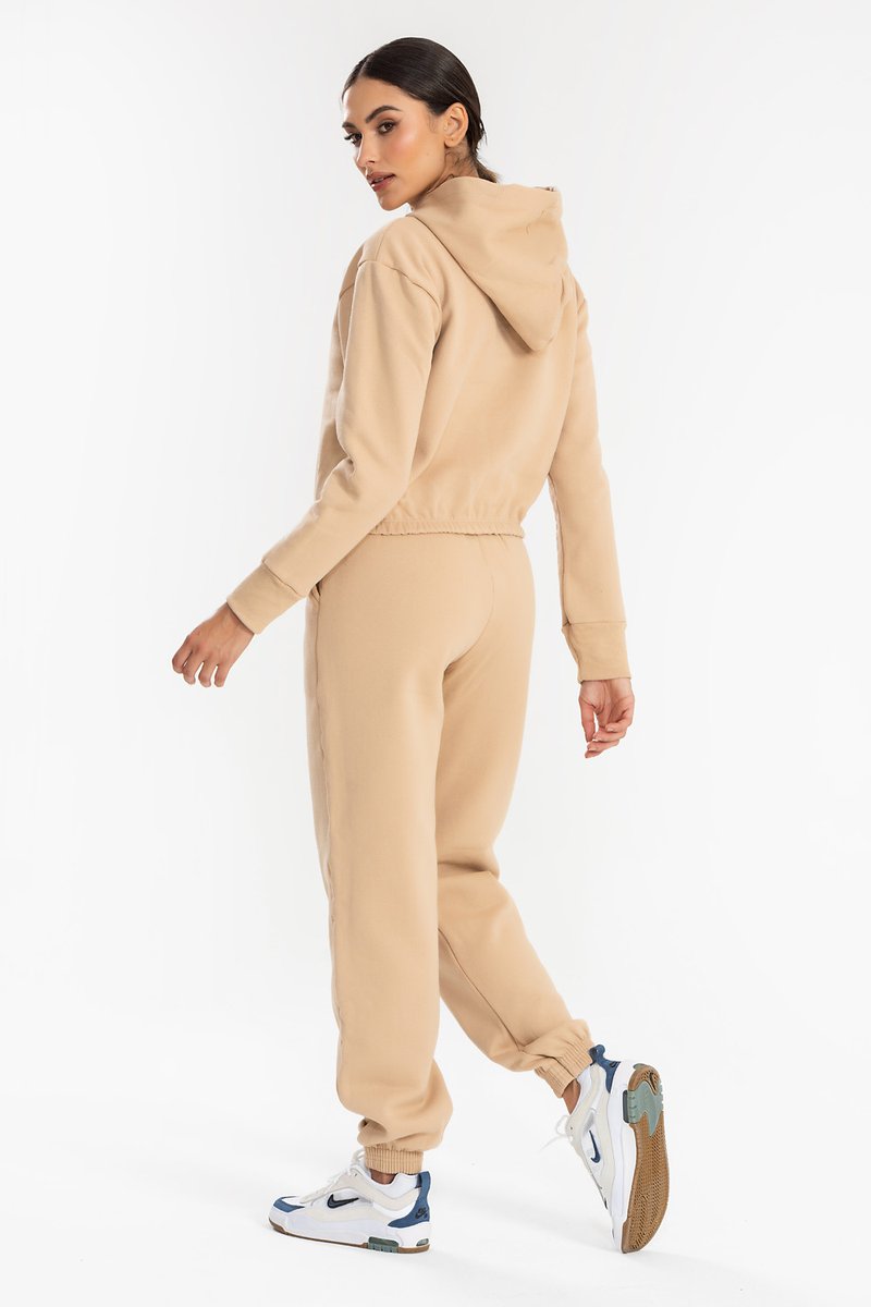 O cropped com capuz traz um visual despojado e contemporâneo, ideal para composições com peças de cintura alta, unindo charme e praticidade. A calça jogger complementa perfeitamente com seu caimento impecável, punhos ajustados que garantem um acabamento moderno e cós elástico com cordão, oferecendo ajuste confortável ao corpo. Juntos, formam um conjunto versátil e cheio de personalidade, perfeito para quem busca estilo sem abrir mão do conforto na rotina.
