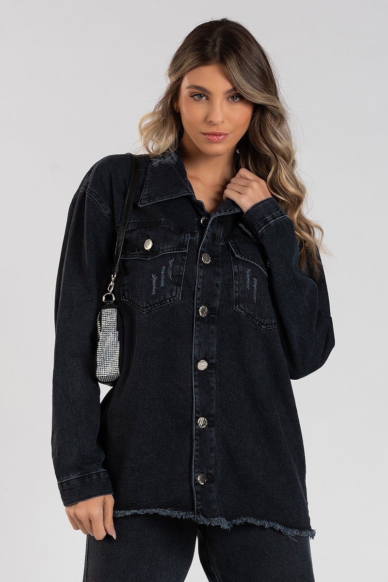 A jaqueta Cindy é uma peça leve, com um tecido de gramatura mais baixa, desenvolvida pensando no conforto dos movimentos. Uma peça rica em detalhes, barra com corte desfiado, bolsos funcionais no busto e fechamento por botões. Não possui bolsos laterais, e a lavação é preto vintage. Se adapta super bem a diferentes biotipos.