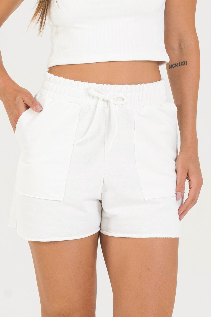 Nosso Short em moletinho é uma super tendência para qualquer ocasião, com caimento soltinho e muito confortável, tem detalhes como bolsos sobrepostos a fio, barra com a bainha cortada a fio, e cordão ilustrativo. O toque é muito agradável, devido a sua composição. O Moletinho tem a estrutura clássica do moletom, mas com o lado avesso em felpa não peluciada, resultando em melhor conforto e transpiração.